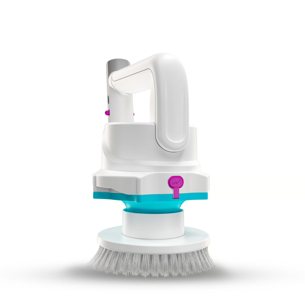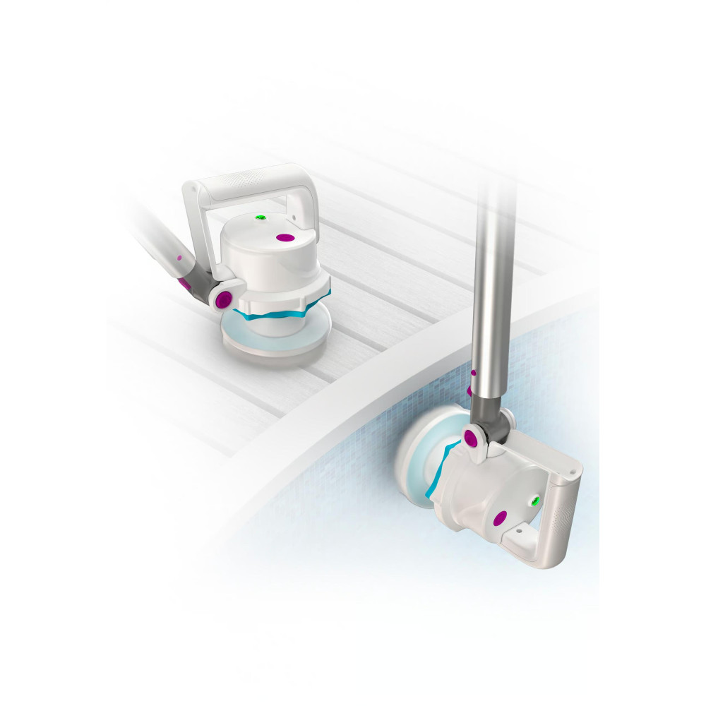 Bateriový rotační kartáč určený pro mechanické čištění bazénových stěn, hladinové linky a okolních ploch. Kompaktní konstrukce umožňuje použití v ručním režimu nebo připojení ke standardní teleskopické tyči pro pohodlné čištění větších ploch.