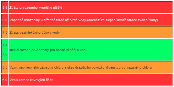 Je nejdůležitější hodnota, kterou je nutné bezpodmínečně dodržovat. Ovlivňuje všechny ostatní faktory bazénové vody, jakož i účinnost všech dezinfekčních prostředků. Ideální rozsah se nachází mezi 7,0 - 7,4. Vyšší hodnota může způsobit zakalení vody (vlivem vylučování vápníku), chlórový zápach a tím i podráždění pokožky a očí, stejně tak mohou být neúčinná opatření při údržbě bazénové vody. Je-li pH - hodnota příliš nízká, může způsobit korozi kovových částí a rychlejší stárnutí a blednutí plastových částí bazénu.
