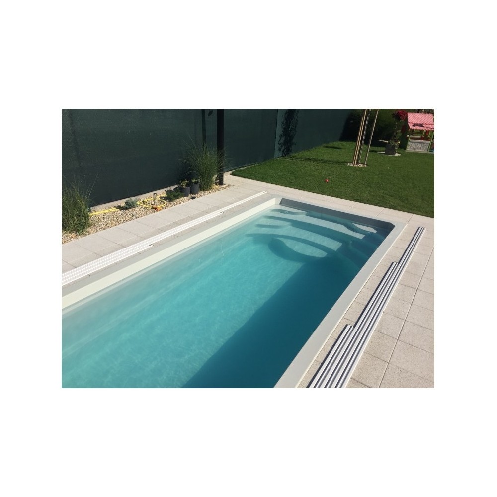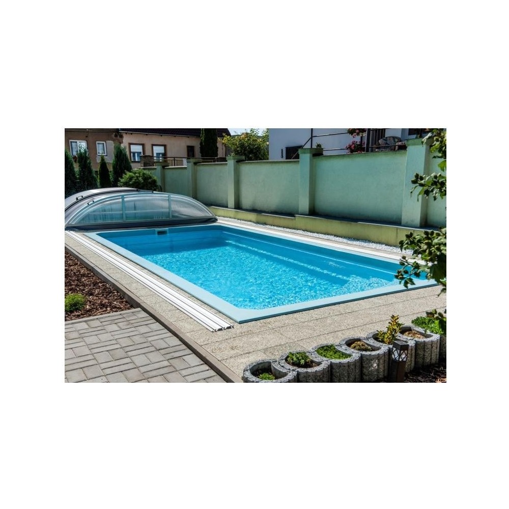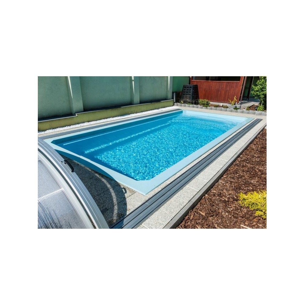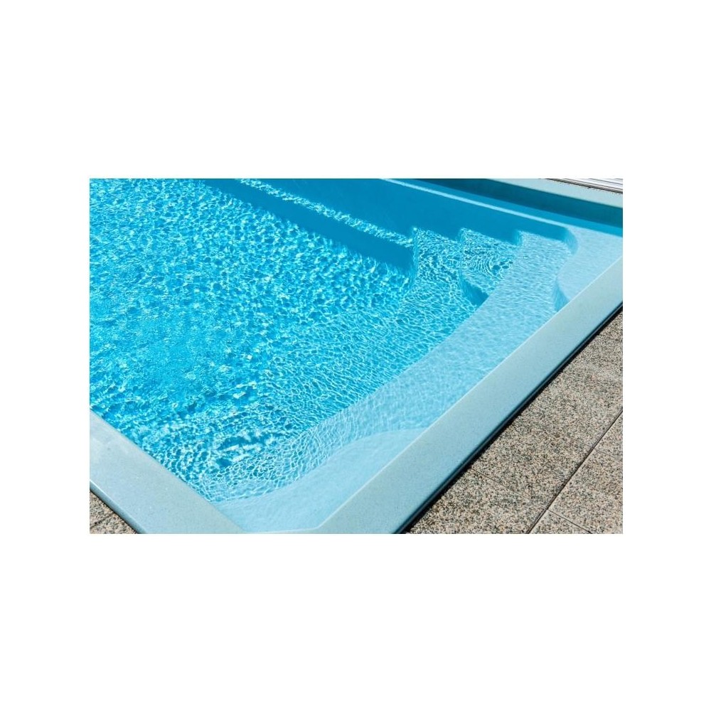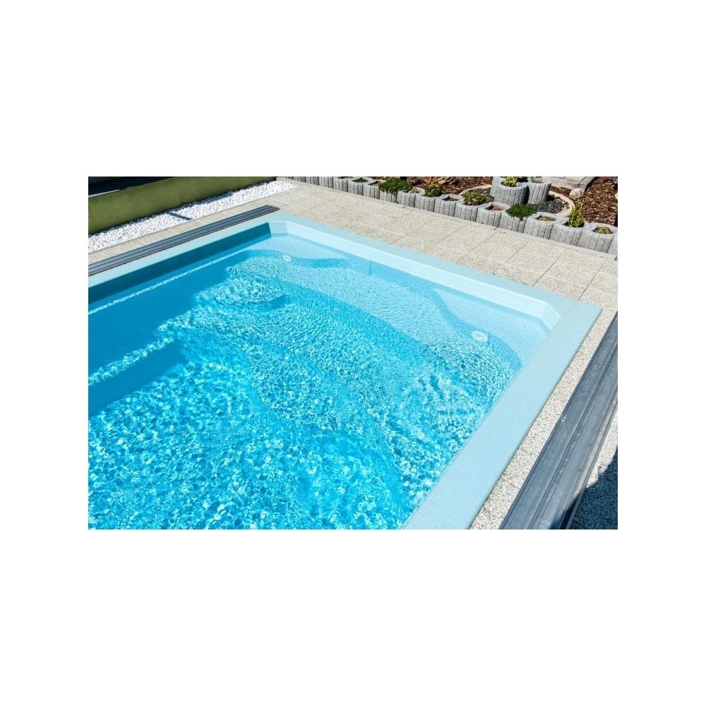 Obdélníkový bazén středních rozměrů s plnohodnotným integrovaným schodištěm, které nabízí pohodlný vstup do bazénu, prostor pro relaxaci, kde si můžete užívat příjemné perličkové lázně. Bazén je po celém obvodu vybaven širokým pochozím límcem, který výrazně usnadňuje a zlevňuje realizaci okolní povrchové úpravy.
