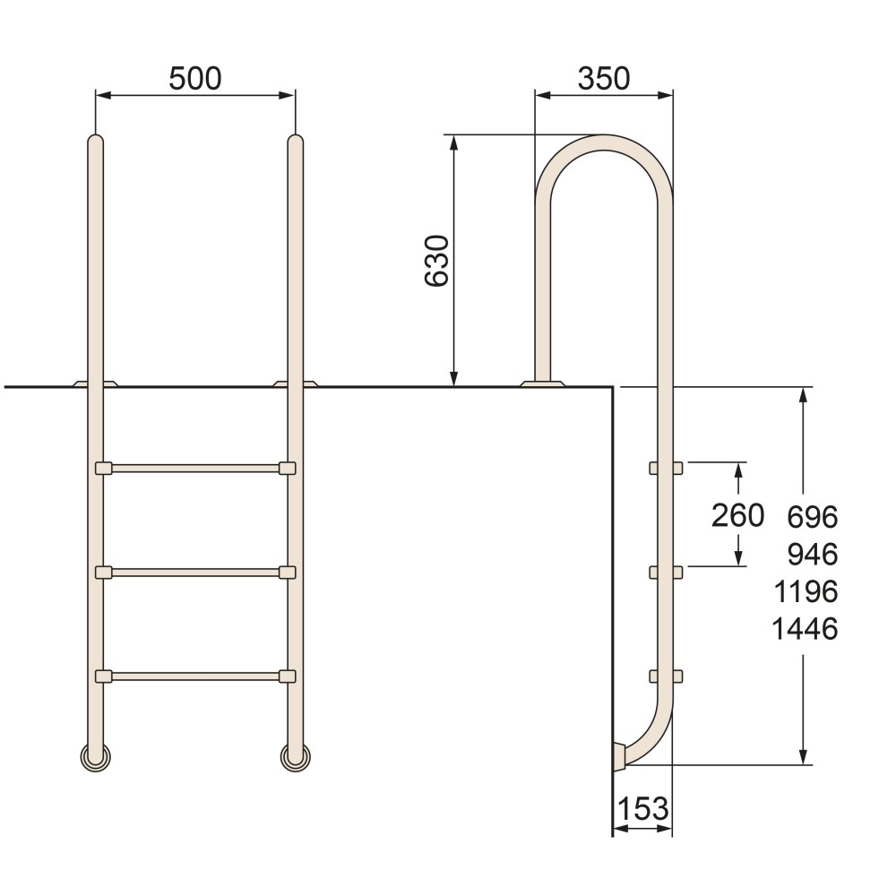 Bazénové žebříky nerez AISI 304 Muro s pouzdrem a 5 stupňi jsou určeny pro privátní a komerční bazény. Jsou vyrobeny z leštěné nerez oceli AISI 316 průměru 43 mm.