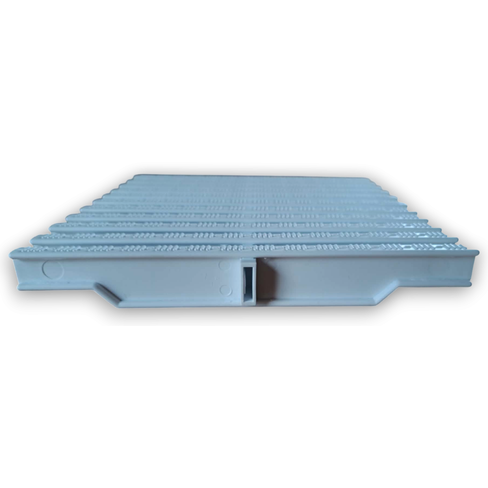 Přelivový rošt, šířka 245 mm, výška 22mm (45ks/m), bílý pro přelivový žlábek, který je vhodný pro atypické tvary bazénů. Na jeden metr délky je potřeba 43 dílů tohoto roštu.