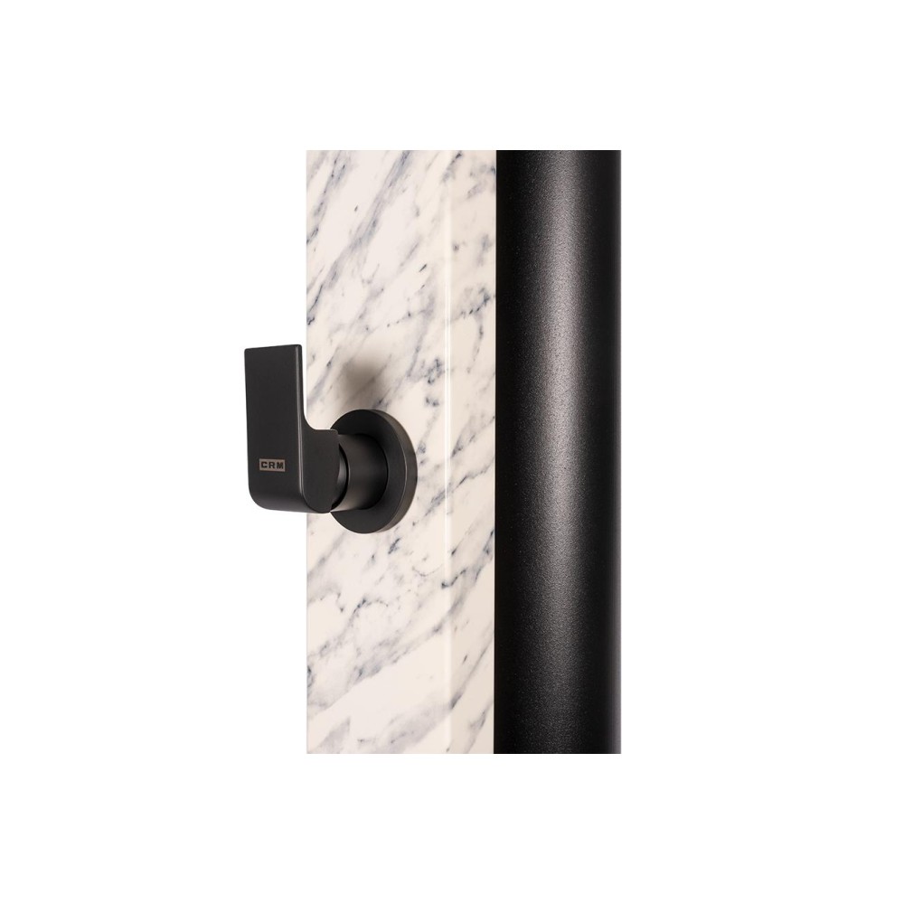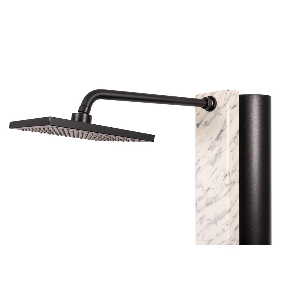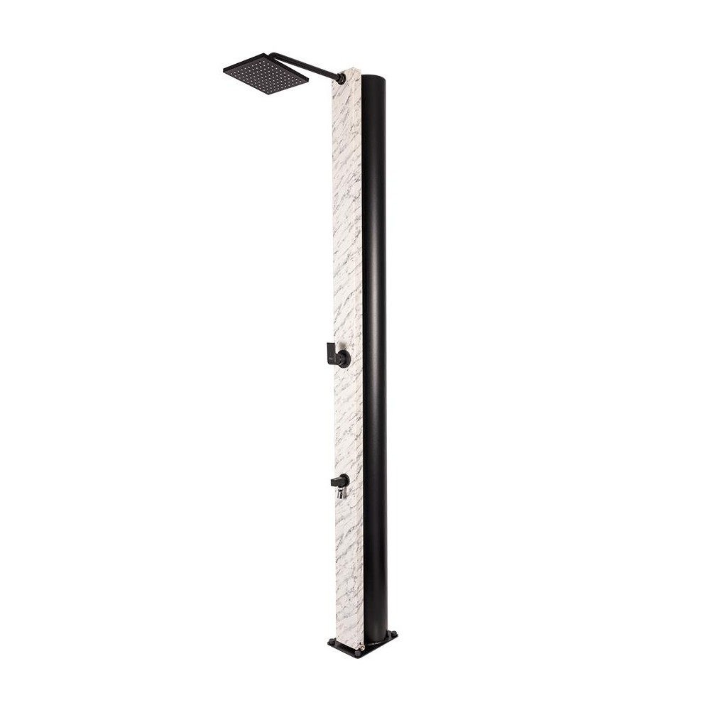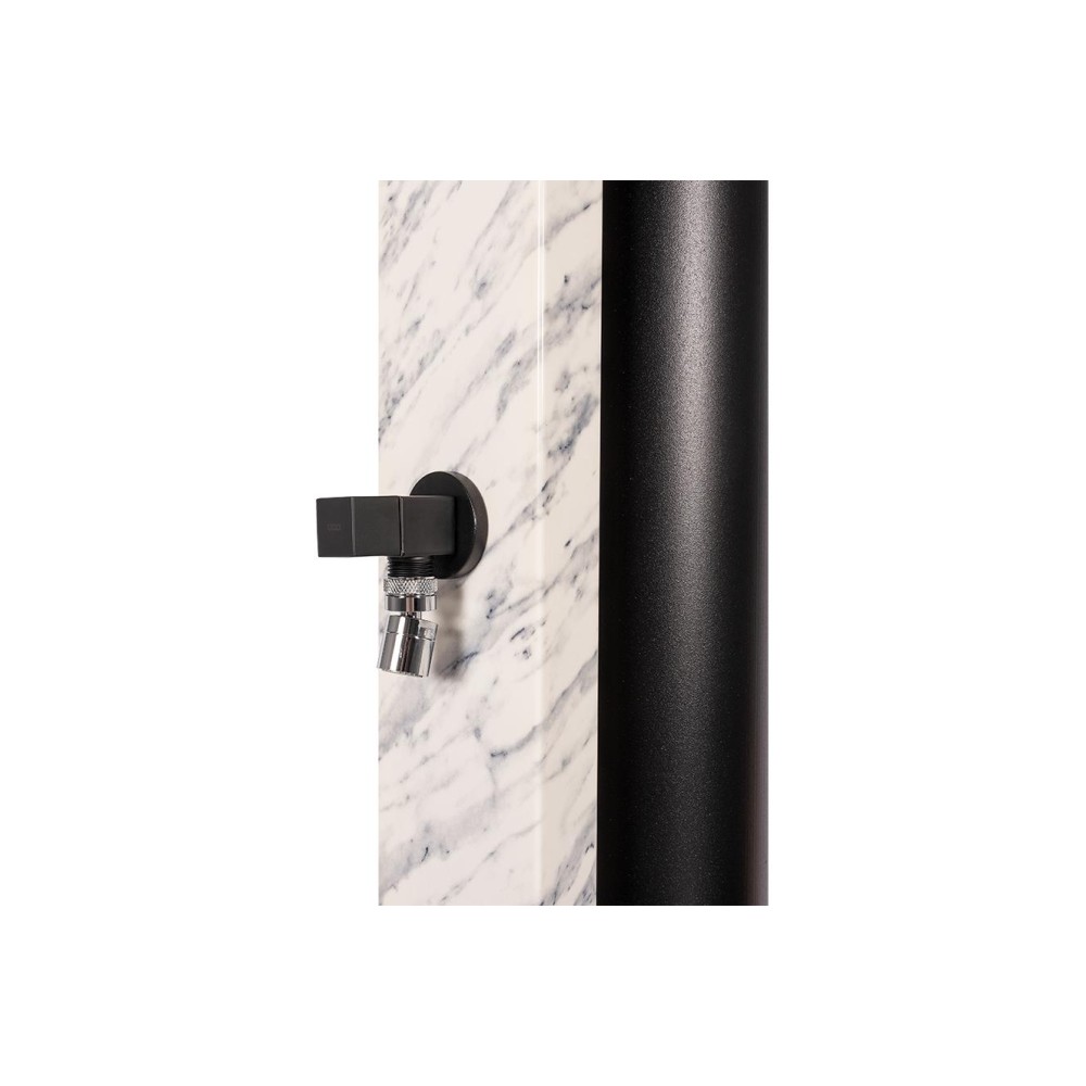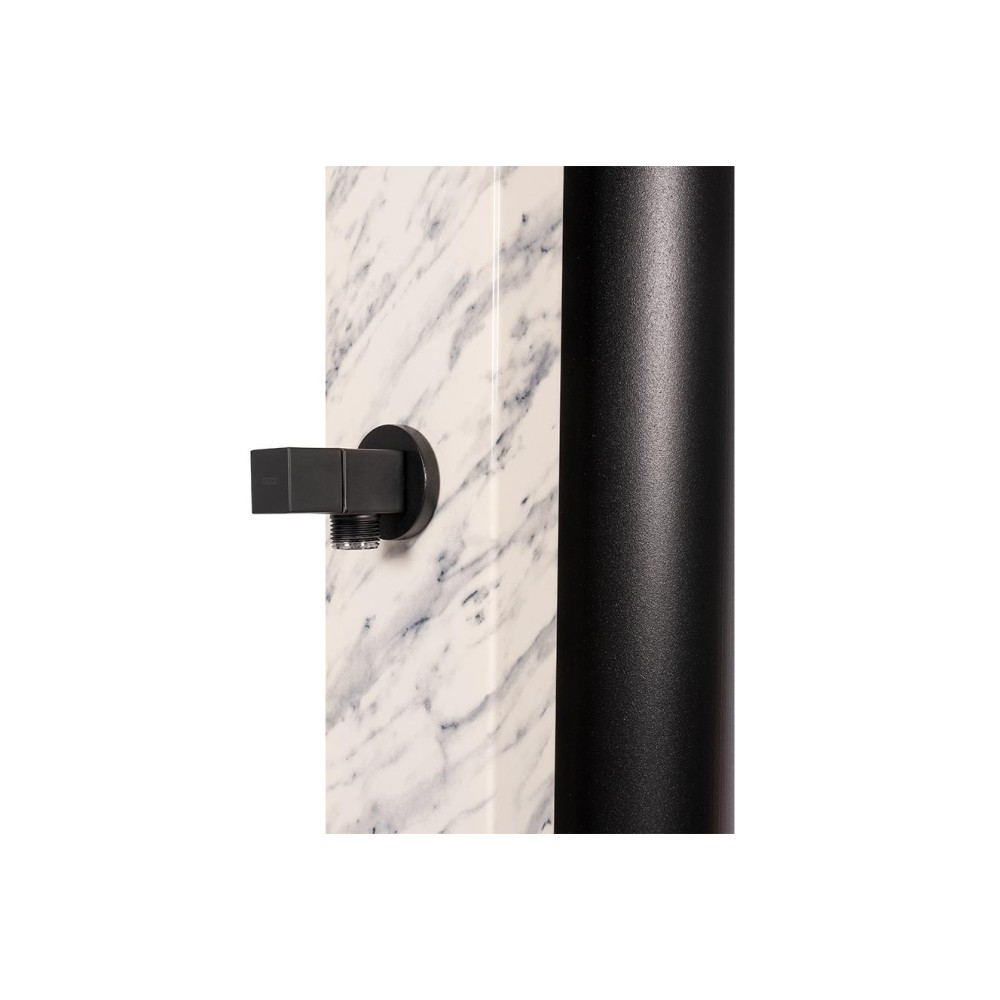 Hliníková solární sprcha s objemem 40 litrů s mramorovou povrchovou úpravou Calacatta Gloss a šířkou 112 mm. Sada obsahuje obdélníkovou mosaznou jednopákovou baterii v matné černé barvě.Má matně černé mosazné rameno (350 mm) na jejímž konci je matně černá sprchová hlavice o velikosti 220 x 200 mm.Tento model je vybaven oplachem nohou.