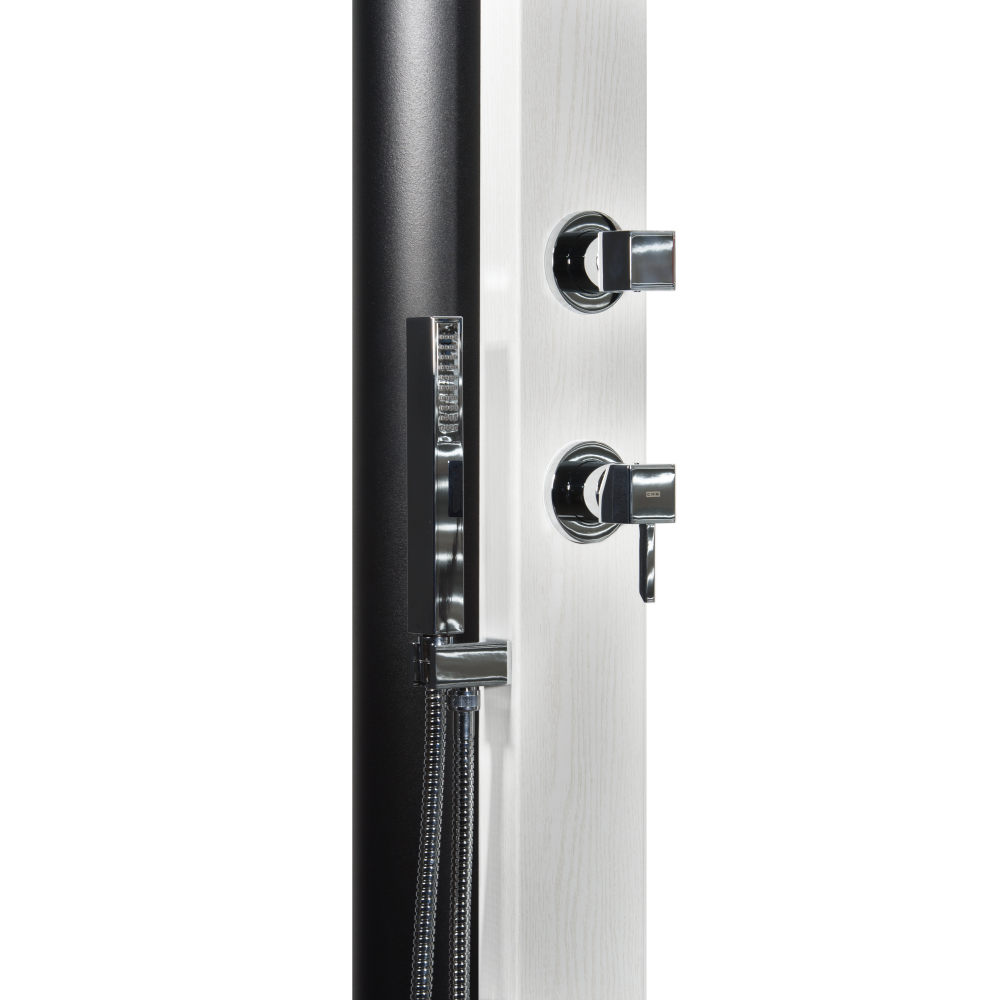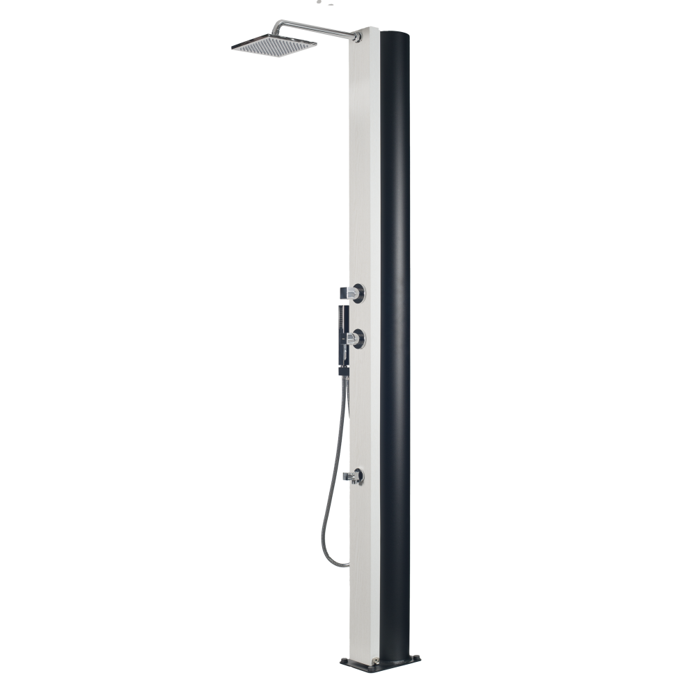 Hliníková solární sprcha o objemu 40 litrů. Přední část je vyrobena z pozinkované oceli s povrchovou úpravou dřeva - bilý dub a šířkou 112 mm. Obsahuje jednopákovou baterii s obdélníkovým designem z pochromované mosazi. Rozměr sprchové hlavice je 200 x 200 mm. Tento model je vybaven sprchou pro oplach nohou.