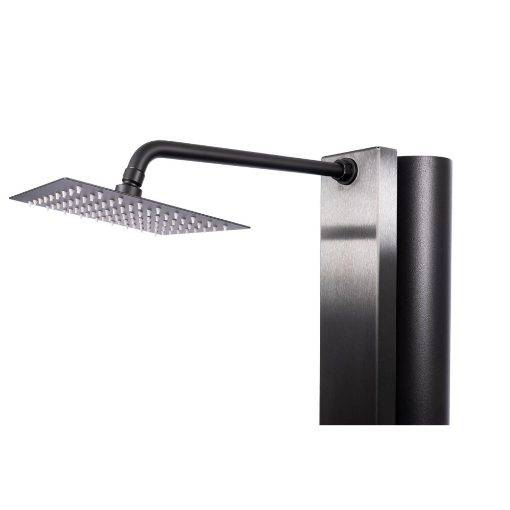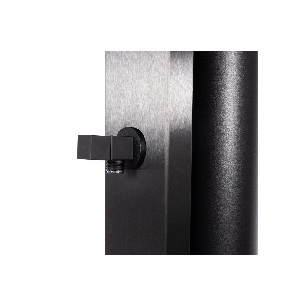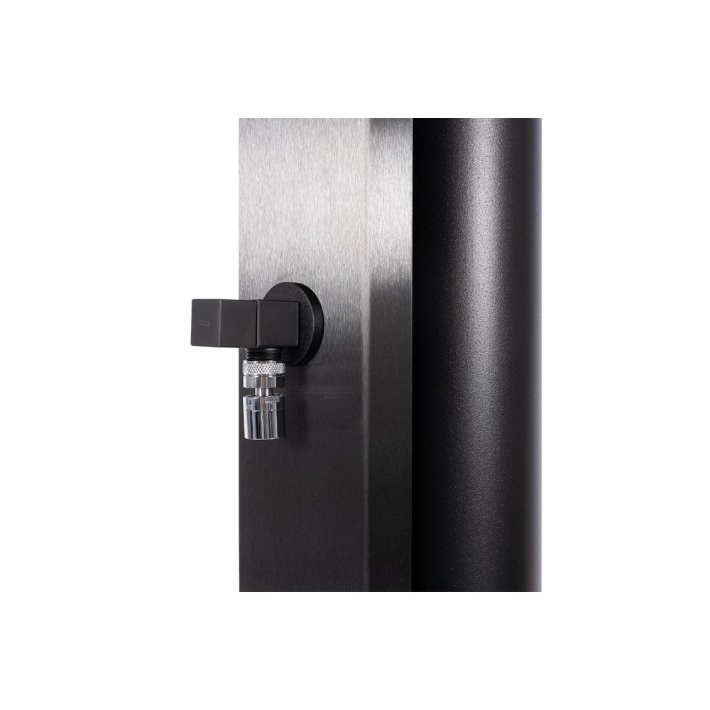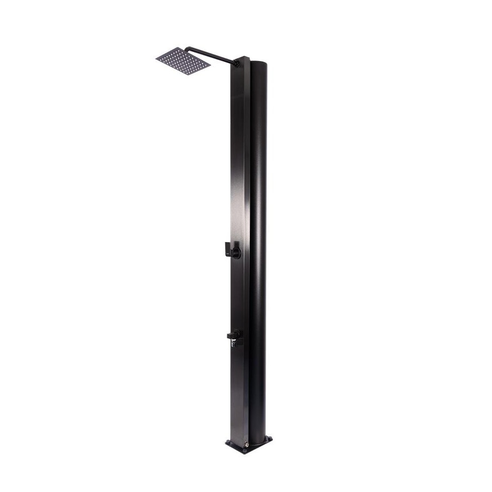 Hliníková solární sprcha s objemem 40 litrů. Přední část z nerezové oceli AISI 304 s povrchovou úpravou Onyx Black PVD Titanium a šířkou 112 mm. Sada zahrnuje obdélníkovou jednopákovou baterii z mosazi, sprchovou hlavici z nerezové oceli AISI 304 (200 x 200 mm), která je na konci ramene o délce 350 mm. Vše je laděno do elegantní matné černé barvy. Vnitřním přívod vody 1/2″. Součástí tohoto modelu je také doplňková baterie pro oplach nohou.